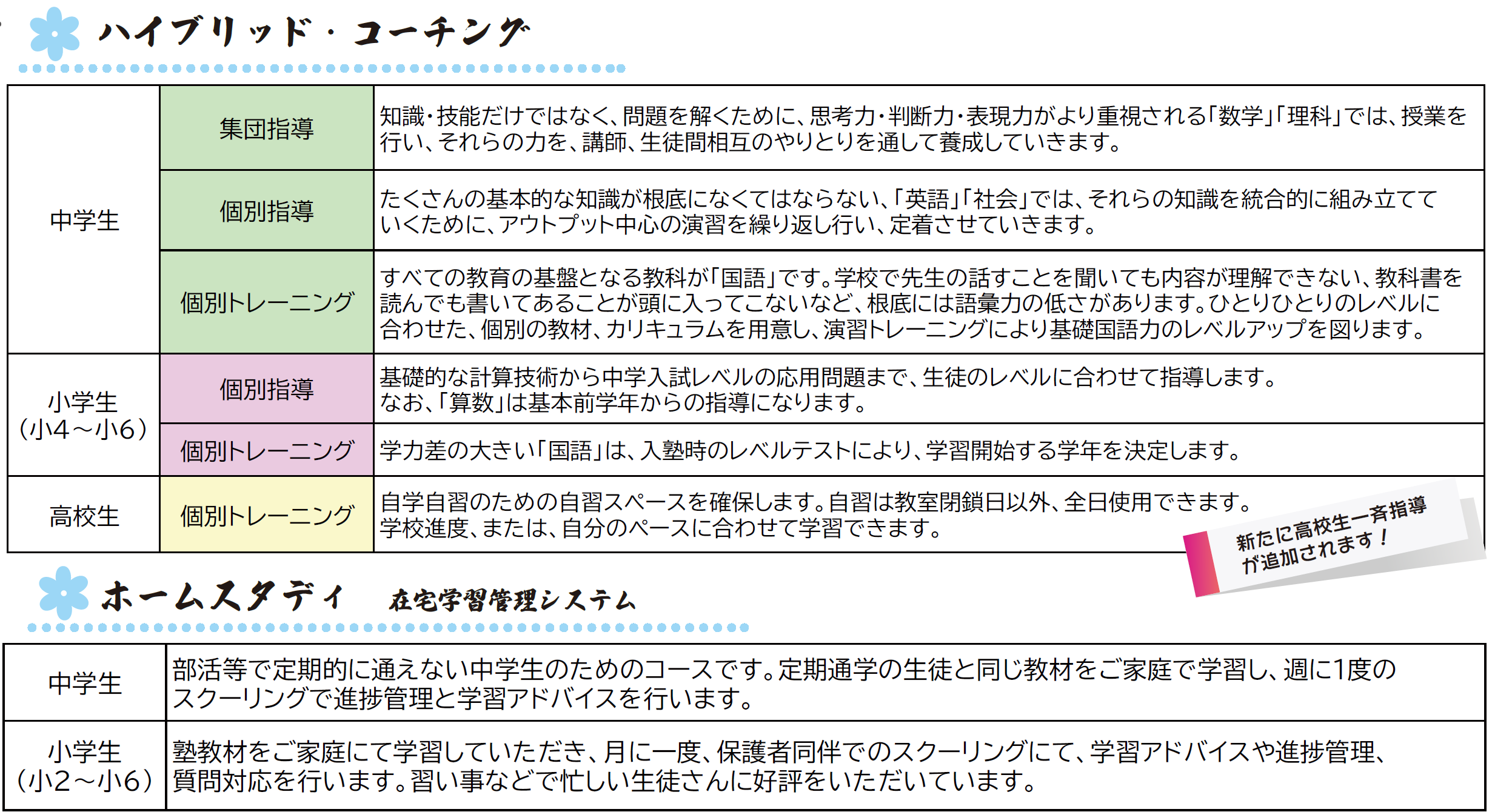 学習していく上で授業を受けることと、演習トレーニングすることは、どちらも必要不可欠なものであり、決して片方が欠けていいものではありません。近年、「反転授業」が脚光を浴びていますが、「ハイブリッドコーチングシステム」は家庭での事前学習を含む、すべてを塾内で完結させる、相反転授業となっています。
